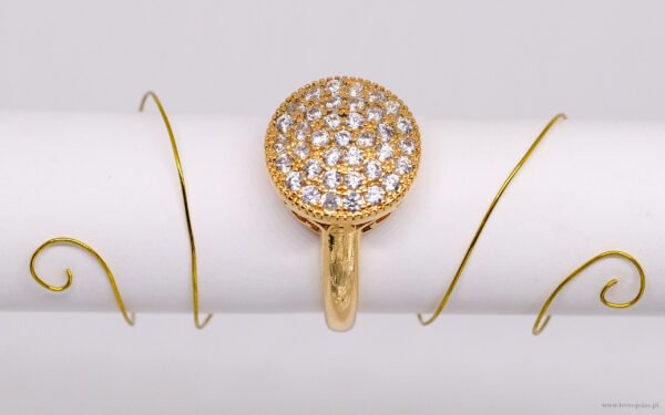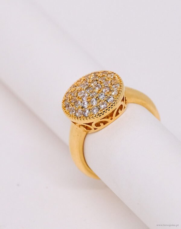 Este sofisticado anel em aço inoxidável com acabamento dourado destaca-se pelo seu elegante topo circular, delicadamente cravejado com pequenas pedras brilhantes que refletem a luz de forma intensa e harmoniosa.