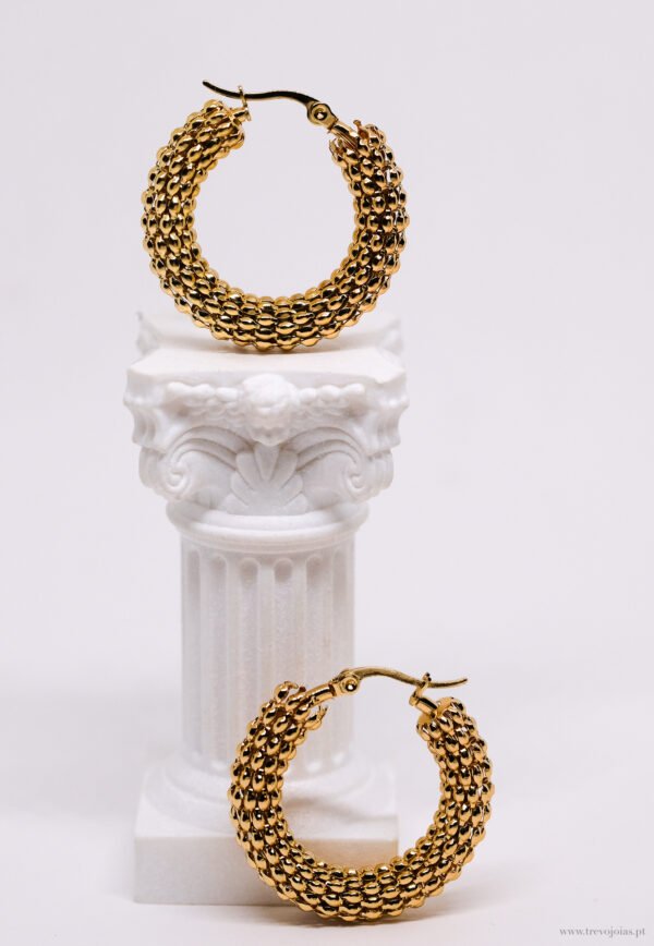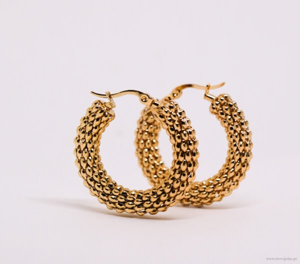 Essa argola aço em aço inoxidável hipoalergênico tem design marcante, com textura que lembra uma colmeia dourada — rica em brilho e personalidade. O fecho click garante praticidade e segurança no uso diário. Uma peça resistente, que não oxida, perfeita para destacar o visual com um toque de moda moderna.
