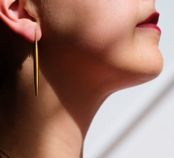 Seu formato alongado e delicado valoriza o pescoço e realça os traços do rosto, criando um efeito sofisticado e moderno. O acabamento dourado polido reflete a luz de forma sutil, tornando-os perfeitos tanto para graças especiais como para complementar looks mais simples do dia a dia.