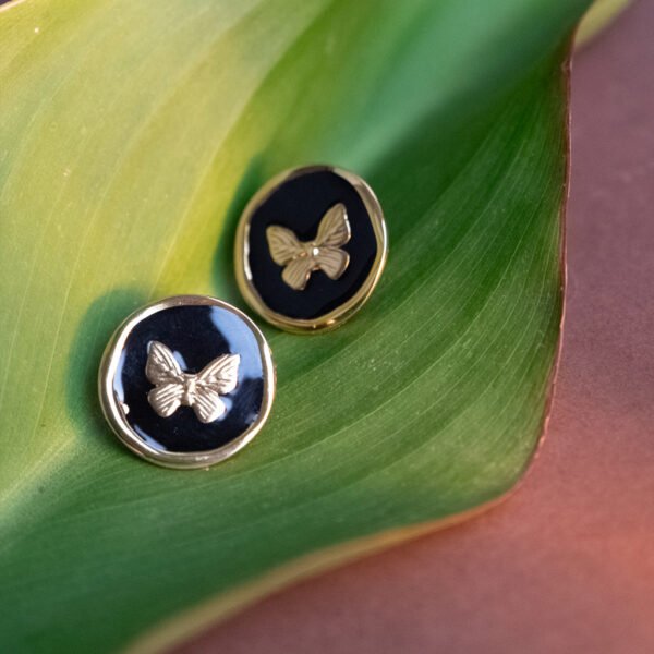 Brincos em aço inoxidável, antialérgico, com borboleta incrustada dourada em fundo preto.