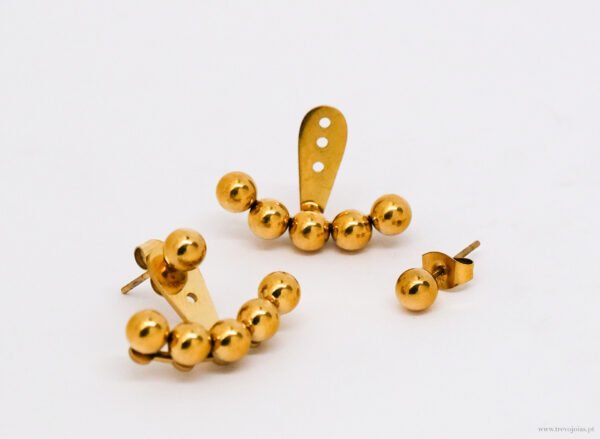 O Brinco Lua de Roma combina formas geométricas com uma estética sutilmente histórica. Suas esferas douradas formam uma curva que remete à lua crescente e aos arcos romanos — símbolo de beleza clássica reinterpretada com modernidade.