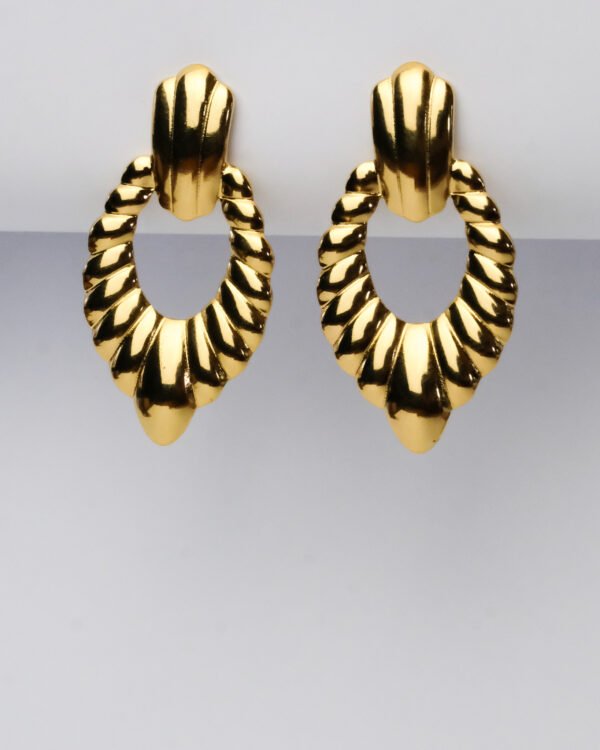 O Brinco Zora traz uma estética forte e refinada, com textura esculpida em forma de aro oval. Seu volume estruturado e acabado dourado cria um jogo de luz impactante — ao mesmo tempo elegante e expressivo.