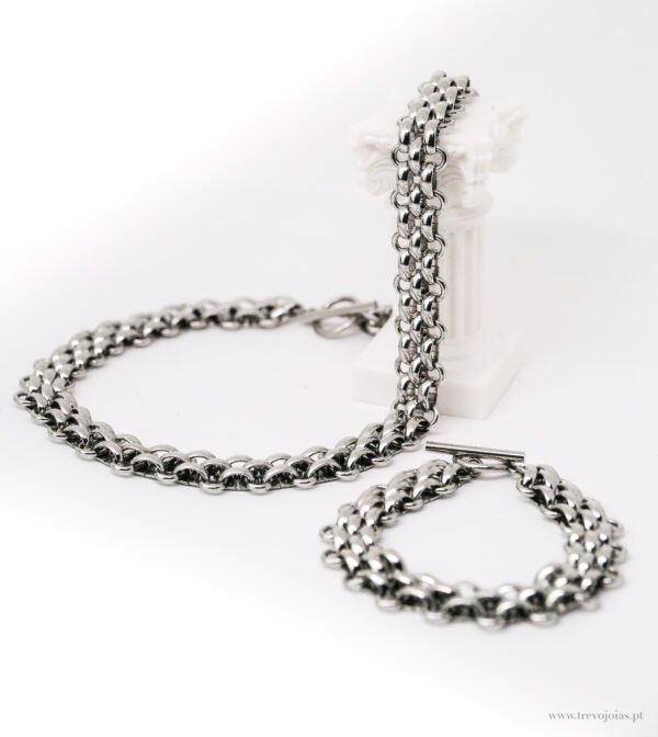 Este conjunto de colar e pulseira em aço inoxidável destaca-se pela sua robustez e elegância moderna. As correntes entrelaçadas criam um design marcante e sofisticado, com um brilho prateado que reflete força e estilo. O fecho tipo barra adiciona um toque contemporâneo, garantindo segurança e conforto no uso diário. Ideal para quem aprecia peças versáteis e de presença, este conjunto combina perfeitamente com looks casuais ou mais formais, oferecendo um equilíbrio entre simplicidade e distinção.