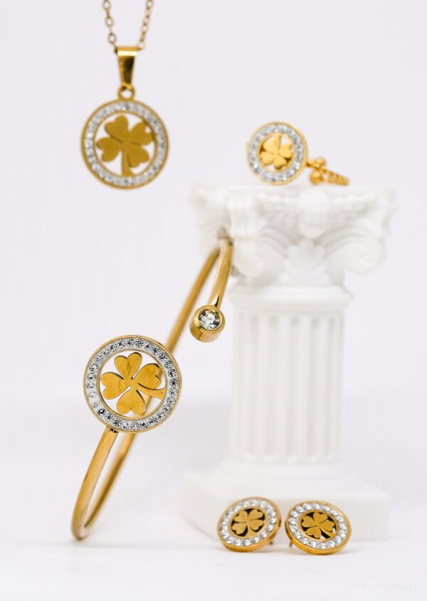 O Conjunto Trevo do Amor é mais do que uma joia — é um amuleto de estilo e significado. Composto por quatro peças (fio, pulseira, brincos e anel), cada uma carrega o símbolo do trevo de quatro folhas, representando sorte, amor, esperança e fé. O acabamento dourado contrasta com os cristais que contornam cada peça, trazendo brilho e sofisticação sem excessos. Um presente com propósito, ideal para marcar momentos especiais com elegância e intenção.