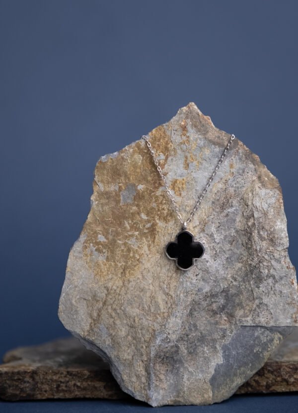 O centro da peça apresenta uma pedra preta com efeito madrepérola, que cria um contraste sofisticado com o brilho do metal prateado, conferindo à joia um toque de mistério e elegância. O seu design simples e refinado torna este fio perfeito para usar no dia a dia ou para complementar um visual mais elegante.