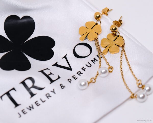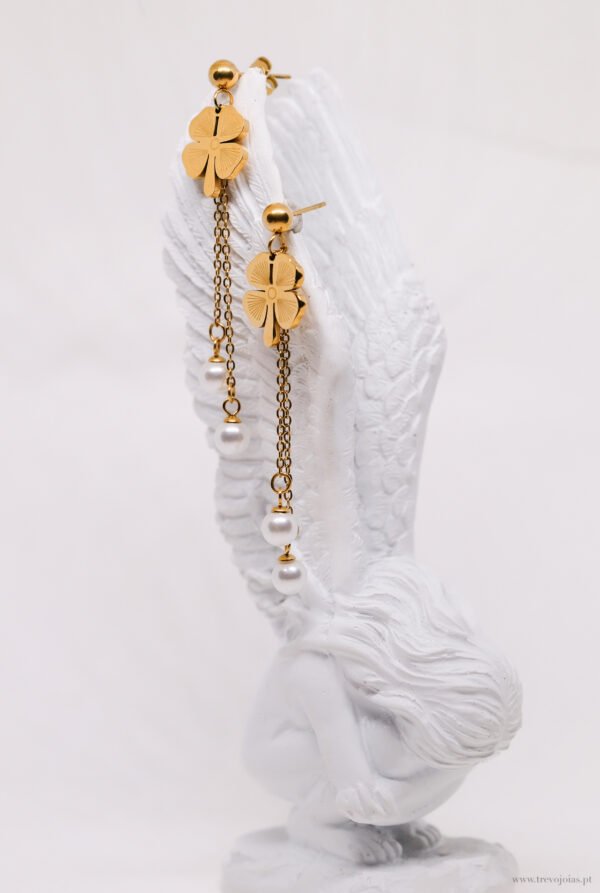 O Brinco Trevo de Encanto celebra o gênero, a leveza e a sofisticação em um design único. Com formato de trevo dourado de quatro folhas, ele simboliza helicópteros e proteção. O destaque fica por conta das delicadas correntes douradas que sustentam pérolas clássicas, criando um movimento suave e elegante.