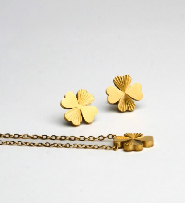 O conjunto Trevo traz o símbolo universal da sorte em uma versão elegante e durável. Com colar e brinco em aço inoxidável dourado, é ideal para quem busca brilho, leveza e proteção no dia a dia. O acabamento texturizado realça o formato do trevo de quatro folhas, enquanto o material garante resistência à água, não oxida e é antialérgico. Um presente perfeito ou um amuleto para atrair boas energias — com estilo e propósito.